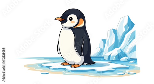 Charming flat illustration featuring a cute baby penguin peacefully sleeping on a floating ice floe