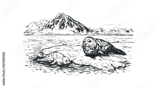 Two Seals resting on ice floe with majestic snowy mountains in the distance, sketched in black ink on a transparent background.. Vector hand drawn illustration