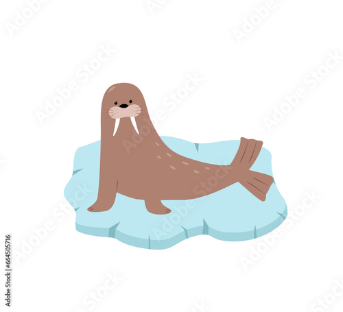 Cute cartoon walrus on an ice floe. Vector illustration arctic animal. Funny character isolated on a white background.