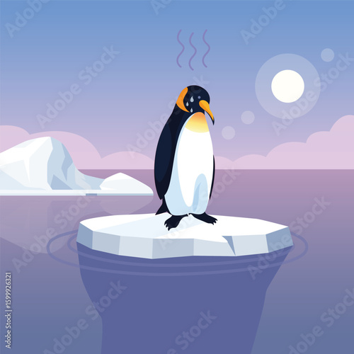 Global warming vector illustration. Penguin on ice floe flat illustration, sea level rise, nature damage.