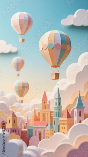 Whimsical paper art hot air balloons floating over a fantasy city, layered clouds, soft gradient skies, handcrafted paper texture