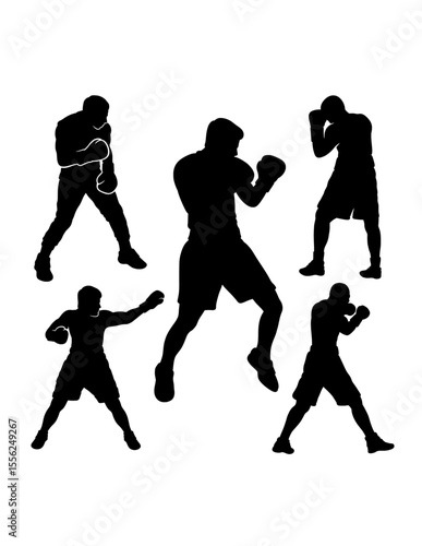 Silhouettes of boxers in various poses showing punches, defense, and stance during training or match