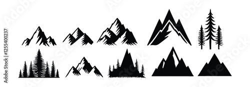 Majestic Mountain Silhouette Illustration with Evergreen Trees for Outdoor Adventure