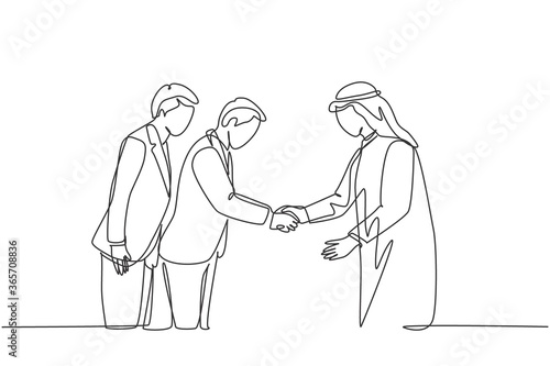 One continuous line drawing of young muslim businessman take bow to respect his Japanese colleague. Saudi Arabian businessmen with shemag, kandura, scarf. Single line draw design vector illustration
