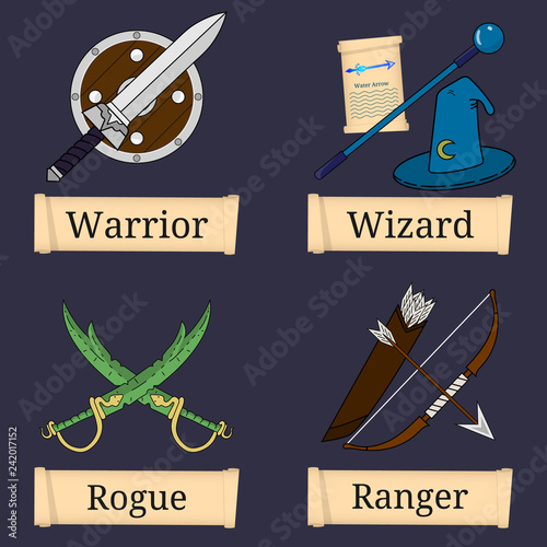 Rpg and gaming icon collection: flat, outline, and filled designs for fantasy adventures