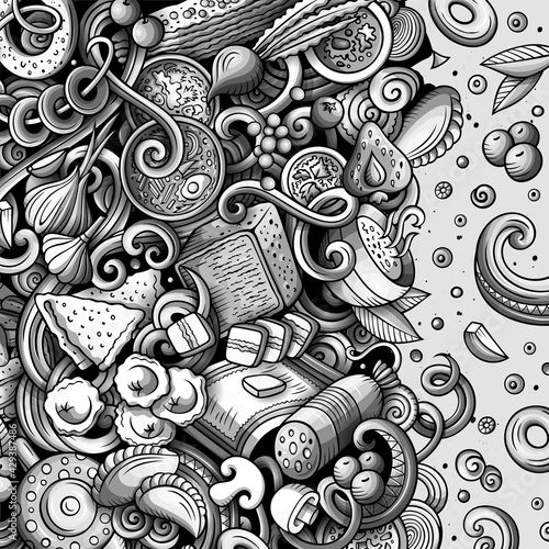 Hand drawn line vector illustration food. Doodle Russian cuisine: soup, dumplings, solyanka, red ?aviar, meat, chicken, vodka, cucumbers, pancakes, bread