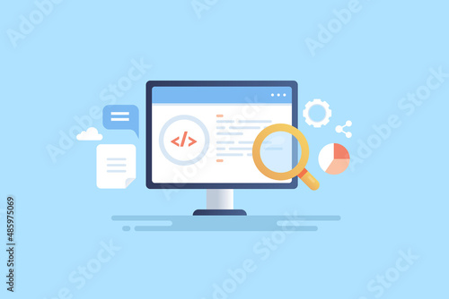 SEO optimization, web page coding, programming, onsite seo, meta data management software application, business technology, web development concept. Flat design web banner template.
