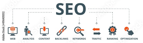 SEO banner web icon vector illustration concept for search engine optimization with icon of website, analysis, content, backlinks, keywords, traffic, ranking, and optimization