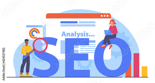 Seo analytics expert, big data business intelligence and analytics seo software, marketing analytics, seo kpi metrics concept. Flat design web banner template.