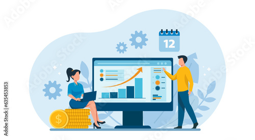 Data analytics or marketing seo optimization concept. Character Woman analyzes graphs, charts, dashboard, prepares a report. Flat Cartoon Vector Illustration, icon. Stylish abstract