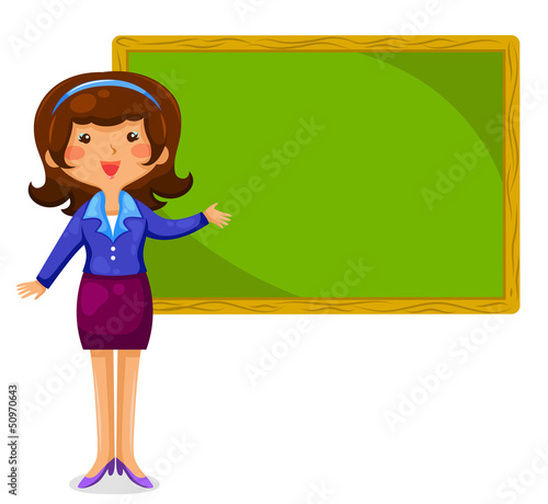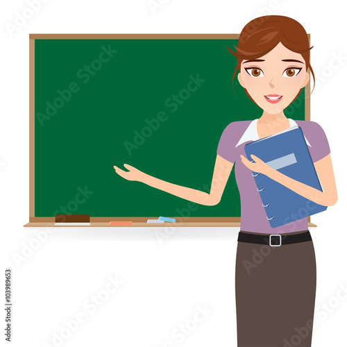 Cartoon character design female school standing in front of blackboard teaching lesson