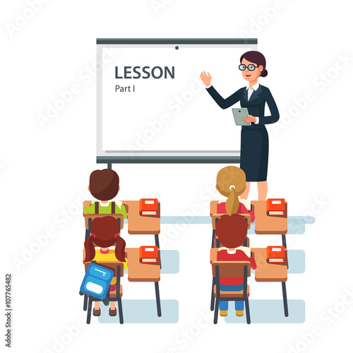 Young female teacher holding a stick pointer standing in front of class teaching on lesson at blackboard