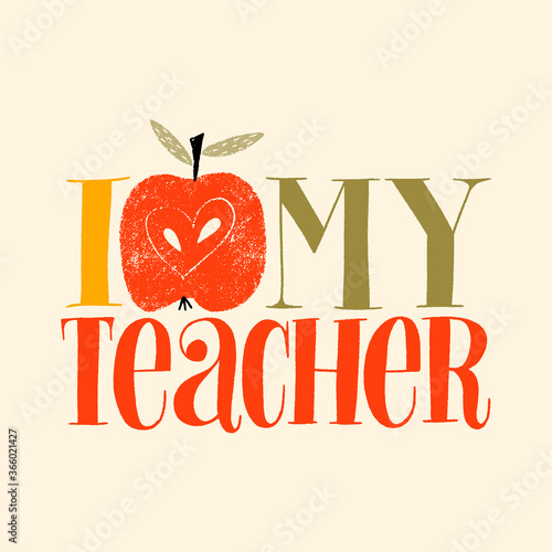 I love my teacher. Hand-drawn lettering quote for teacher appreciation with a red apple. Phrase for merchandise, social media, web design elements. Vector phrase on a colored background.