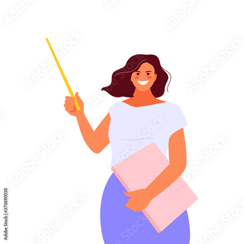 Smiling female teacher with a pointer in her hands. Teacher day vector character