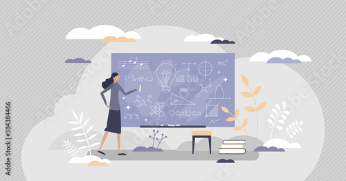 Chalkboard or blackboard with teacher writing scribble tiny person concept
