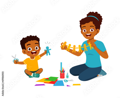 Six designs of groups of diverse young kids in kindergarten class with their teachers doing various activities, colored vector illustration