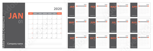 Wall calendar for 2020 year in minimal style with Place for Photo. Week Starts on Sunday. Set of 12 Months.