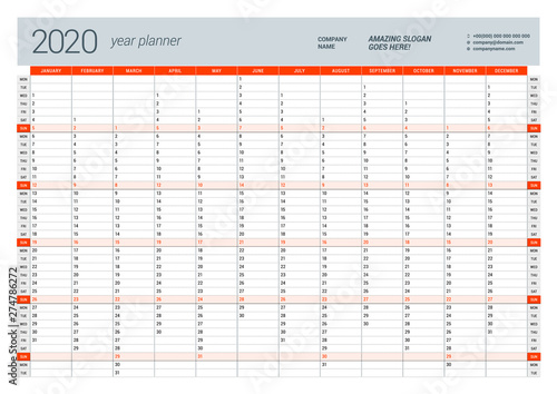 Spanish Calendar 2020 year. Vector. Week starts Monday. Spain calender template. Yearly stationery organizer in minimal design. Horizontal landscape orientation.