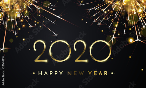 2020 New Year. 2020 Happy New Year greeting card. 2020 Happy New Year background. 2020 Happy New Year background with gold glitter champagne bottle.