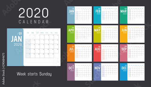 Calendar 2020. Colorful set. Week starts on Sunday. Basic grid. English vector calender collection for print. New year. Color simple design
