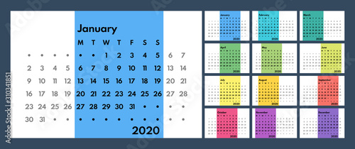 Desk Calendar 2020 template business. Week starts on Monday. Set of 12 calendar pages designs print layout. Wall calendar planner templates.