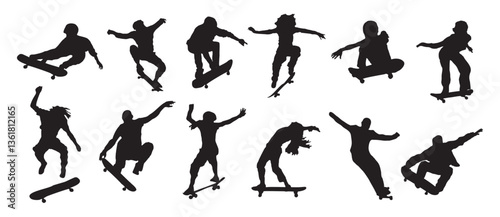Silhouettes of young people jumping in fashionable clothes. Vector silhouettes man and women, illustration. EPS 10 version.