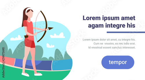 Young black archer holding bow and arrow during archery competition. Sportswoman aiming with bow and arrow to the target. Archery sport concept. Vector cartoon illustration. Square layout.