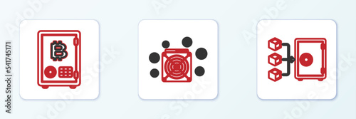 Set line Blockchain technology, Cryptocurrency bitcoin with circuit, Shield, Crossed pickaxe, Smart contract, Mining farm, ASIC Miner and icon. Vector
