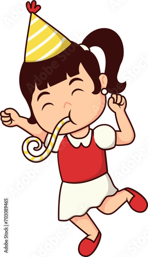 Cute Girl Character Blowing Dragon Whistle in New Year Party, Little Kids with Dancing Happily wearing Party Hat