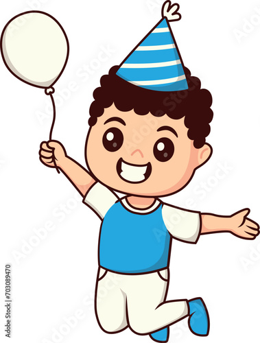 Clip Art Cute Kids Character Holding Balloon in New Year's Party, Little Boy with Happy Expression and Jumping Gesture