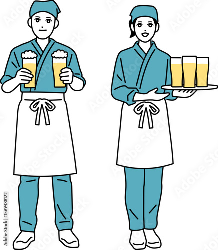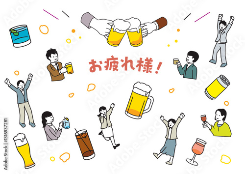 ビアガーデンでビールなどお酒を飲む人物、日本語タイトルのA4サイズのベクターテンプレート Vector template of a person drinking beer or other alcoholic beverages in a beer garden.