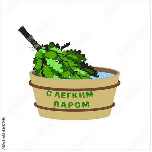 Bathhouse poster with cyrillic quote "Enjoy Your Bath".Sauna and bath equipment: tub with water and oak broom. Vector stock illustration in cartoon style. Russian language.