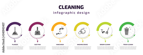 cleaning infographic template with icons and 6 step or option. cleaning icons such as plunger, dust pan, hand wash, washing dishes, broom cleanin, trash cleanin vector. can be used for banner, info