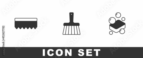 Set Sponge, Handle broom and Bar of soap icon. Vector