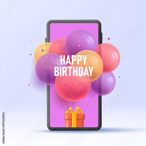 Birthday banner poster design with realistic 3d air balloons. Vector holiday anniversary party decoration background