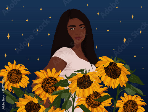 a dark-skinned, dark-haired woman in a wreath of yellow flowers. vector modern flat illustration. for poster, banner, postcard, magazine or book cover.