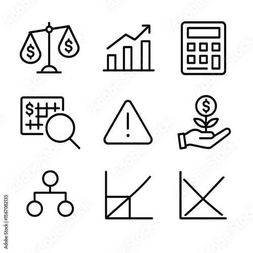 Cost-Benefit Icons Set. Outline icon set of cost-benefit analysis: cost scale, benefit chart, calculator, ROI graph, magnifying