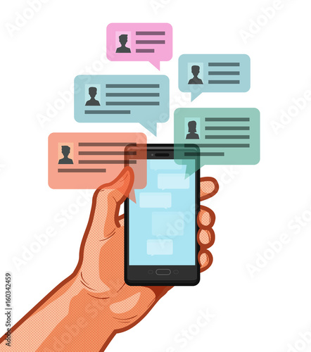 Hand holding smartphone, touching screen and write message in social network. Vector.