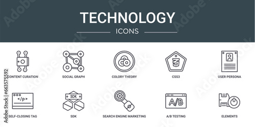 technology infographic element with outline icons and 6 step or option. technology icons such as structural elements, declarations, social graph, content curation, touristic, retro microphone