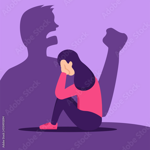 depressed woman because of toxic and grumpy parents. Girl sitting crying scared with angry shouting father big shadow silhouette on the wall vector flat illustration