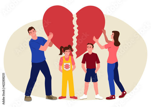 Vector illustration of divorce proceedings with a split house, broken heart, legal papers, and scales of justice, symbolizing separation, property division, emotional stress, and family conflict