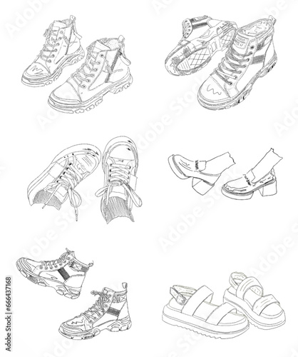 Kids' Footwear Fun. Footwear fashion children?s coloring book illustration, outlined drawing, cheerful display
