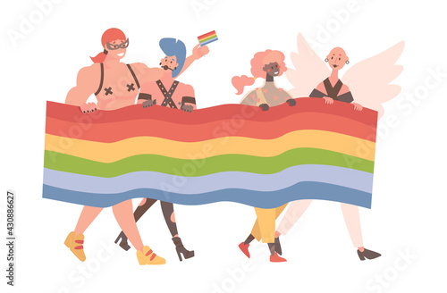 Men and women taking part in LGBT pride vector flat illustration. Male and female characters in colorful leather clothes carrying rainbow flag. Lesbian, gay, bisexual, transgender, and queer people.