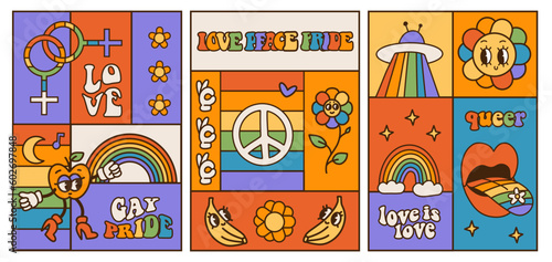 Lgbt pride rainbow sticker. Heart and love icon pack design. Lgbtq month illustration with groovy patch collection. Colorful festival drawing with cute lesbian and bisexual fun label cartoon set