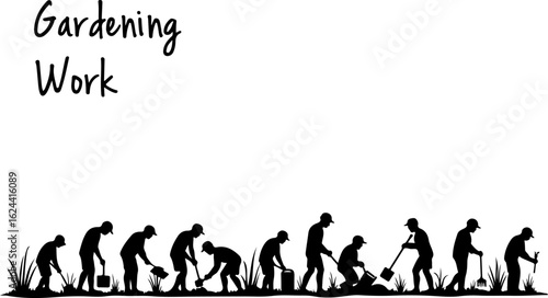 Silhouettes of gardeners performing various gardening activities, planting, digging, watering, raking, pruning, hoeing, using tools, working outdoors, agriculture, horticulture scene