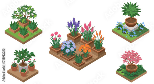 Isometric arrangement of outdoor plant gardens with vibrant flowers and foliage