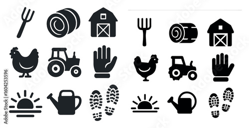 Agriculture and farming silhouette icons set – barn, tractor, gardening elements