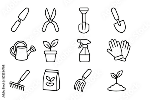 Set of line style web icons showing essential gardening tools and plant care equipment for landscaping, home gardening, garden maintenance, and horticulture tasks