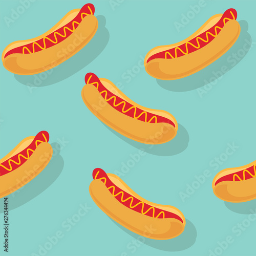 Hot dogs with sausage, tomato ketchup and mustard sauce seamless pattern. Pattern hot dogs on colored background.