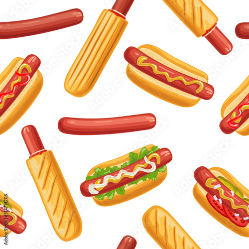doodle junk food in seamless pattern that is hotdog and tomato ketchup also mustard on white background